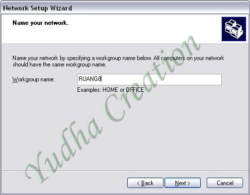 Masuk ke pilihan Nama workgroup contoh kita isikan dengan nama : ruang8 (workgroup diberi nama ruang8)